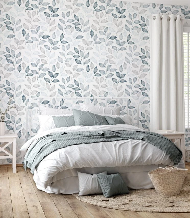 Dopełnieniem aranżacji pokoju z deseniem szarych i niebieskich liści na ścianach mogą być białe lub ciemnoniebieskie meble.