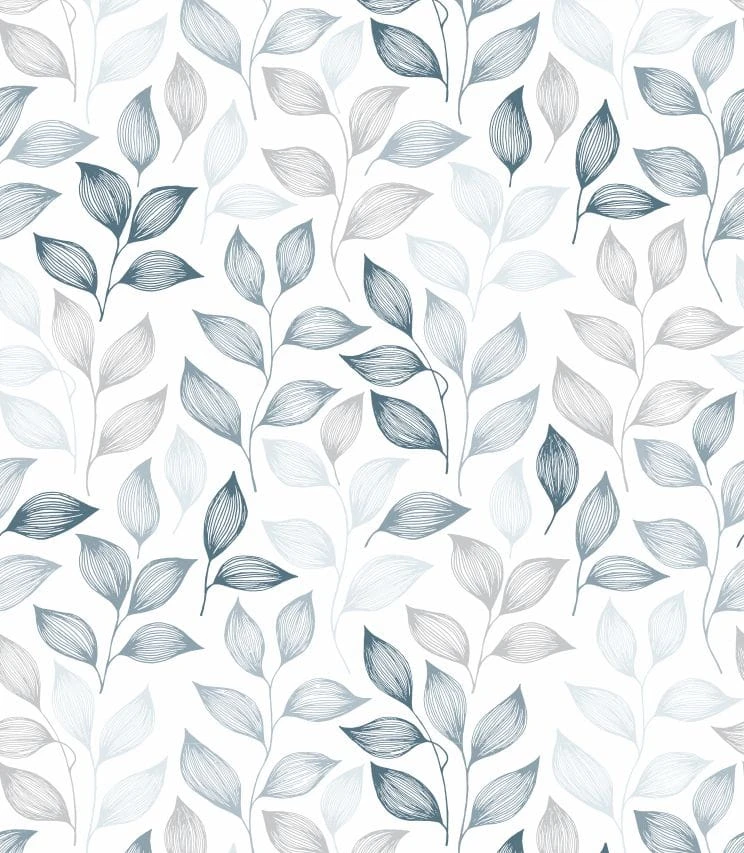 Delikatna, jasna tapeta w szaro-niebieskie liście.