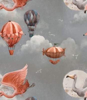 Gwiazdy, których znajdziemy wiele na tapecie błyszczą wśród balonów i flamingów. Bajkowa tapeta stanowi piękna ozdobę i pomysł na odmianę wnętrza pokoju Twojego dziecka.