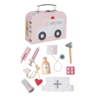 Zapakowane w praktyczną walizkę wykonaną z lakierowanej trwałej tektury- idealnie nadaje się na prezent. Wszystkie akcesoria w zestawie są precyzyjne i bardzo estetyczne, dzięki temu zabawa nimi to sama przyjemność. Dzieci uwielbiają naśladować dorosłych – a takie zabawy pomagają im oswajać się z codziennością i przyswajać zasady społecznych zachowań w grupie. Drewniany zestaw lekarski dla dzieci szwedzkiej marki Jabadabado to gwarancja udanej zabawy.