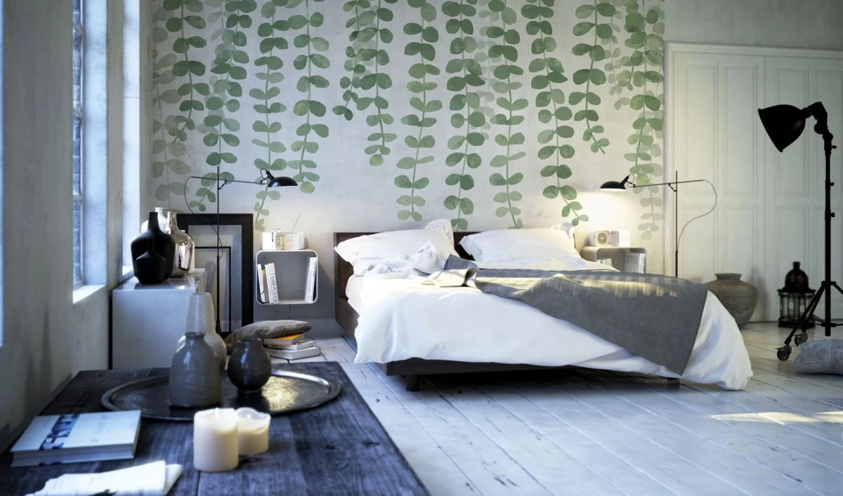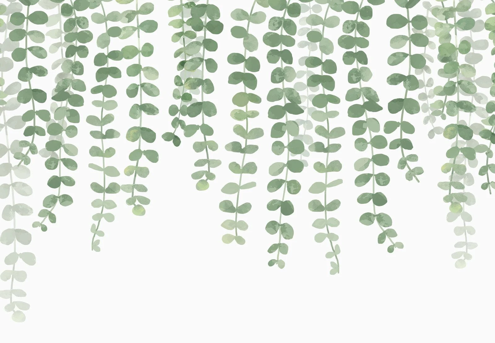 Piękna fototapeta w zielone gałęzie bluszczu. Bluszcz opada od góry ściany w dół. Odmieni i ożywi Twoje wnętrze w prosty sposób.