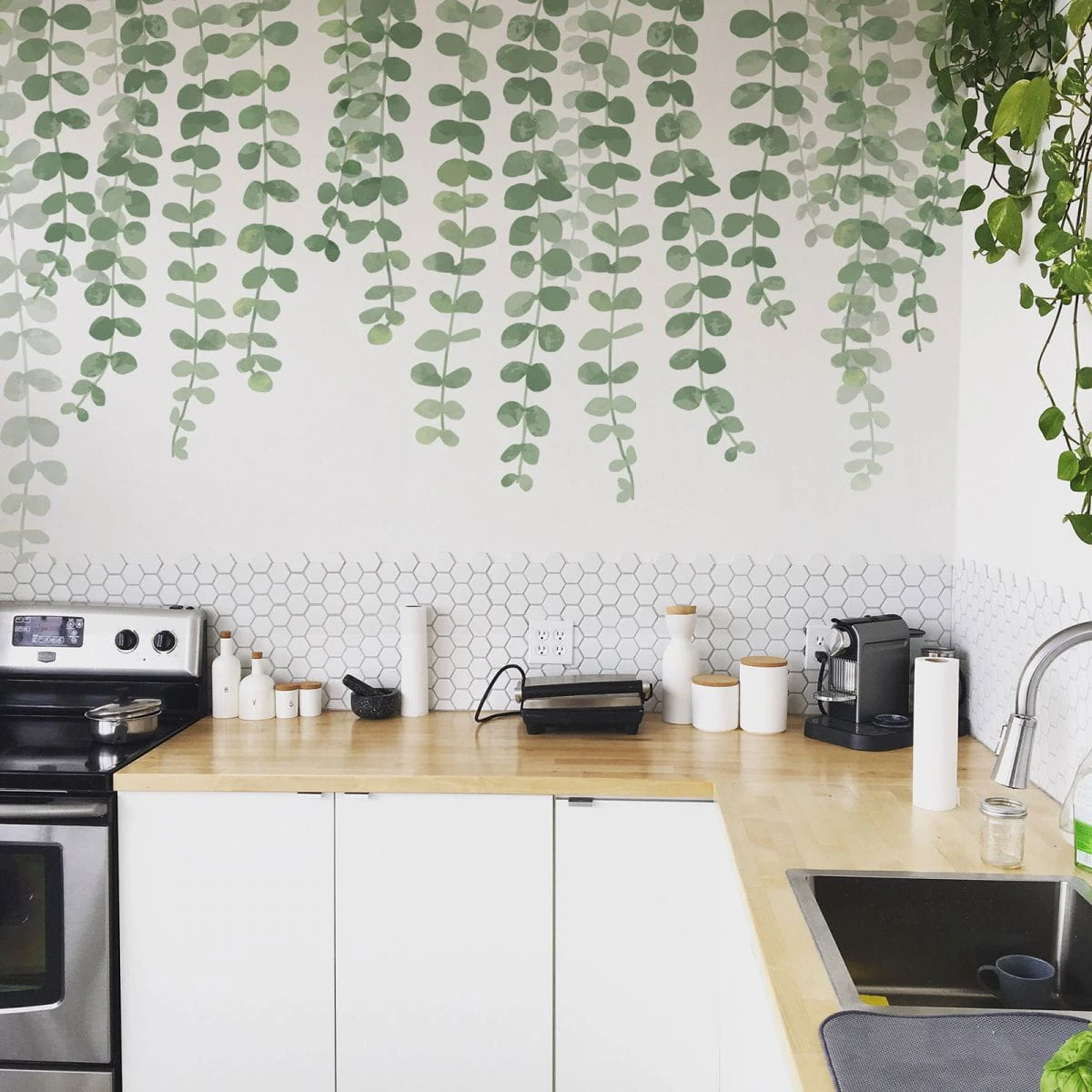 Piękna fototapeta w zielone gałęzie bluszczu. Bluszcz opada od góry ściany w dół. Odmieni i ożywi Twoje wnętrze w prosty sposób.