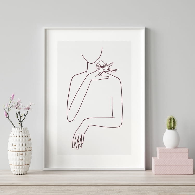 Nowoczesny plakat na ścianę – Kobieta z kwiatem na palcu- nada charakter Twojemu wnętrzu.