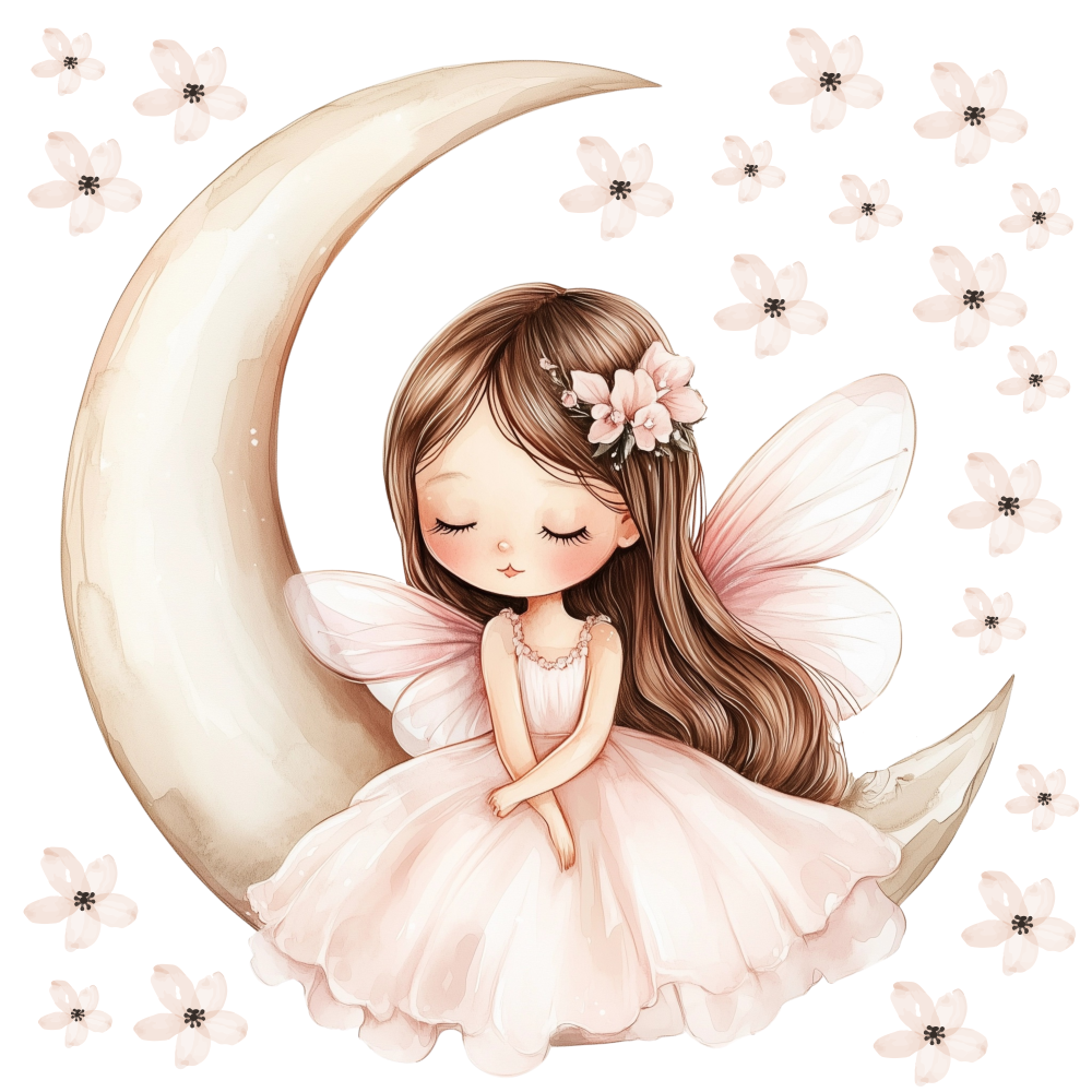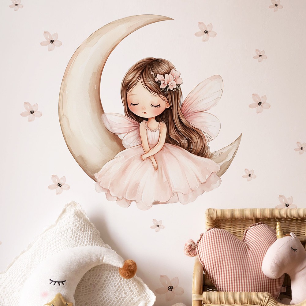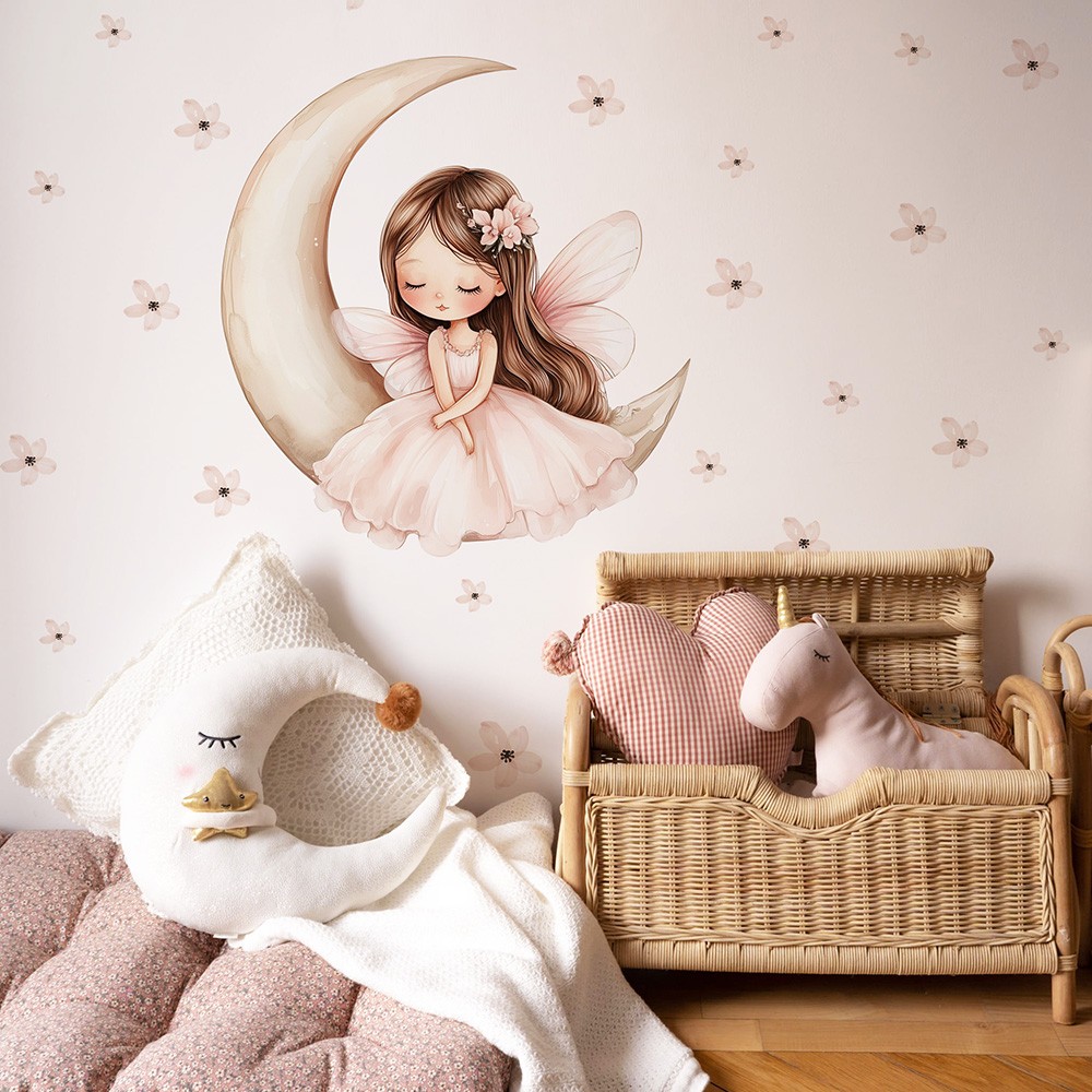 Naklejka przedstawia urokliwą dziewczynkę siedzącą na księżycu, otoczoną delikatnymi kwiatami, które nadają całości magiczny i bajkowy charakter. Ta wyjątkowa dekoracja wprowadza do pokoju dziecięcego atmosferę spokoju, marzeń i fantazji, idealną do tworzenia przytulnej i inspirującej przestrzeni. Subtelne detale i delikatne kolory sprawiają, że naklejka świetnie komponuje się z różnymi stylami wnętrz, dodając im wyjątkowego uroku i ciepła.