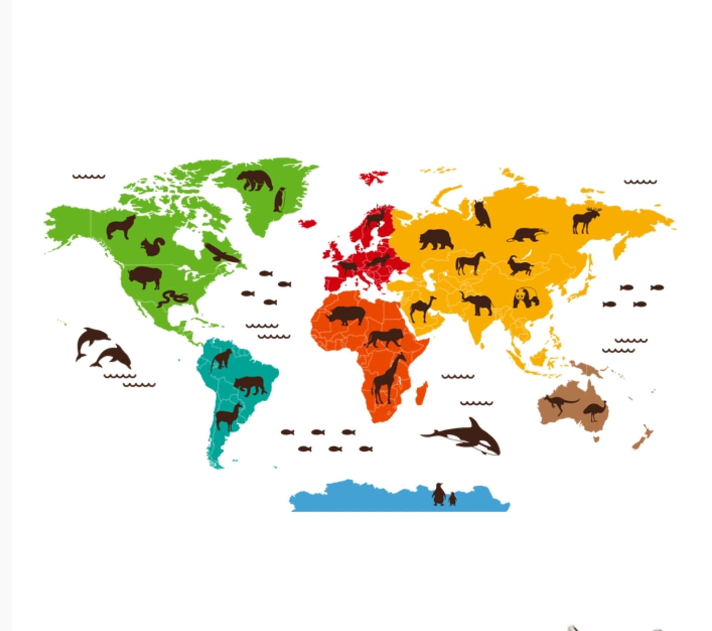 Mapa świata z kolorowymi kontynentami w stylu watercolor, zestaw zawiera również zwierzątka w kolorze czarnym do dowolnego rozmieszczenia.