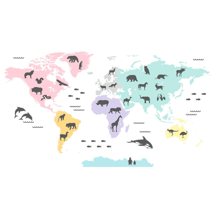 Mapa świata z kolorowymi kontynentami w stylu watercolor, zestaw zawiera również zwierzątka w kolorze czarnym do dowolnego rozmieszczenia.