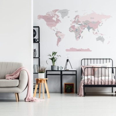Naklejka na ścianę Mapa Świata różowa z oznaczeniami