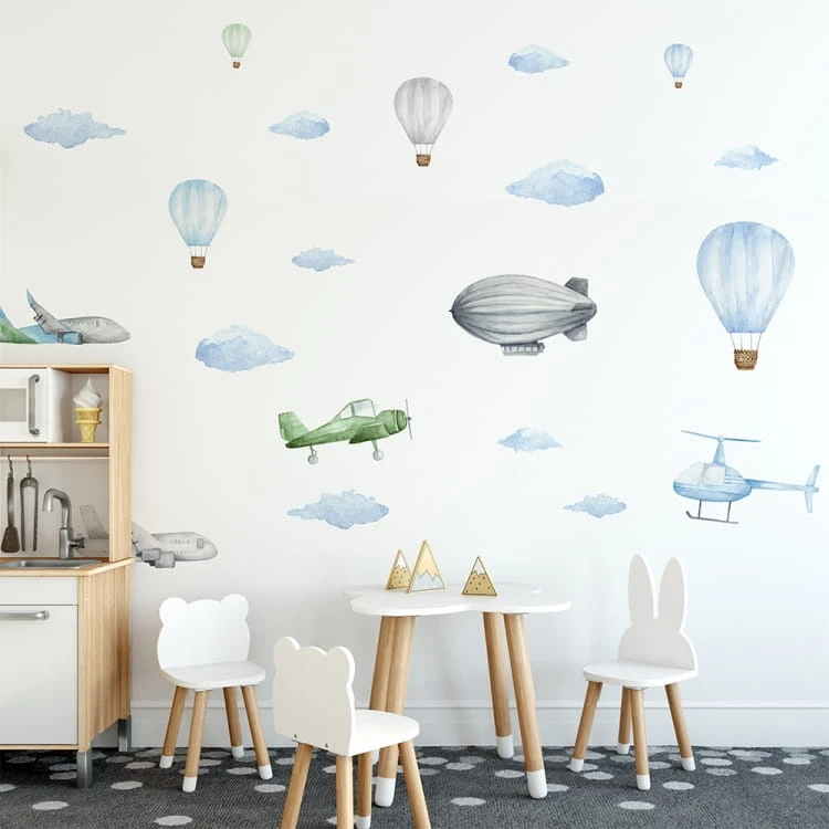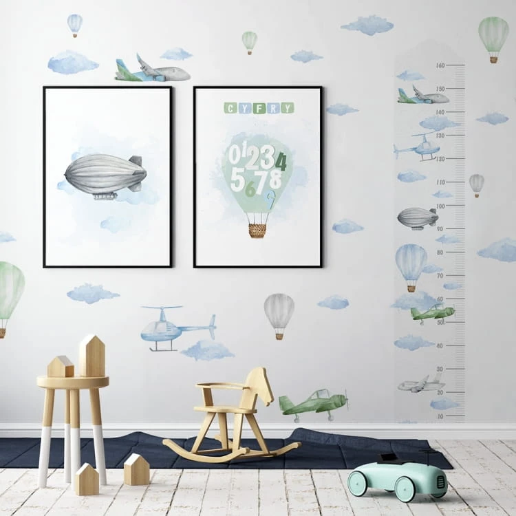 Piękne naklejki ścienne, które ozdobią pokój małego wielbiciela podróży i samolotów.