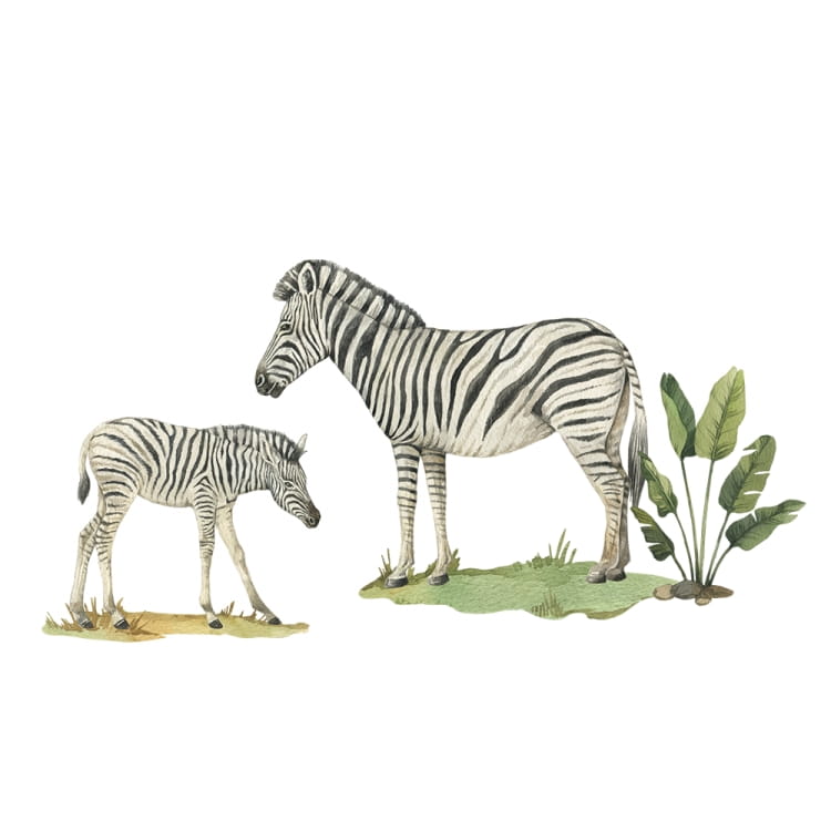 Naklejki ścienne DK430 to kolejna rodzinna odsłona świata dzikich zwierząt. Zestaw dekoracji ściennych obejmuje dwie zebry, a skoro to zwierzęta roślinożerne to w komplecie koniecznie musiała się znaleźć choć odrobina zieleni.