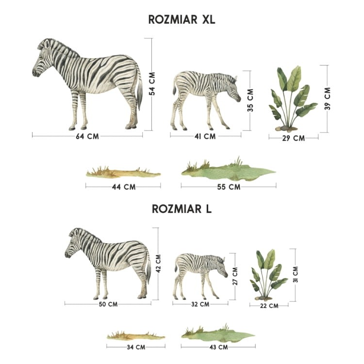 Naklejki ścienne DK430 to kolejna rodzinna odsłona świata dzikich zwierząt. Zestaw dekoracji ściennych obejmuje dwie zebry, a skoro to zwierzęta roślinożerne to w komplecie koniecznie musiała się znaleźć choć odrobina zieleni.