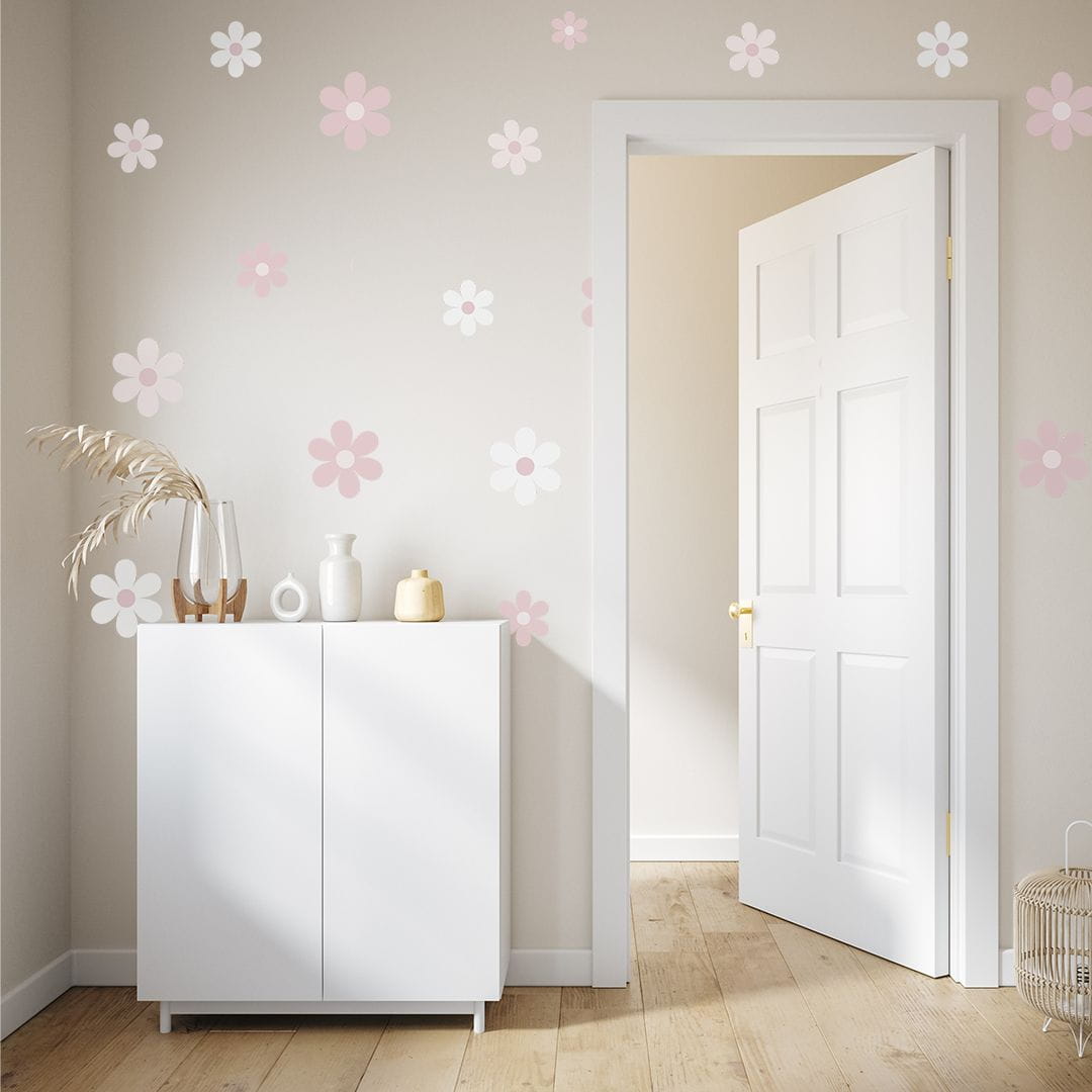 Drukowana naklejka stokrotki z folii matowej do pokoju dziecięcego.
