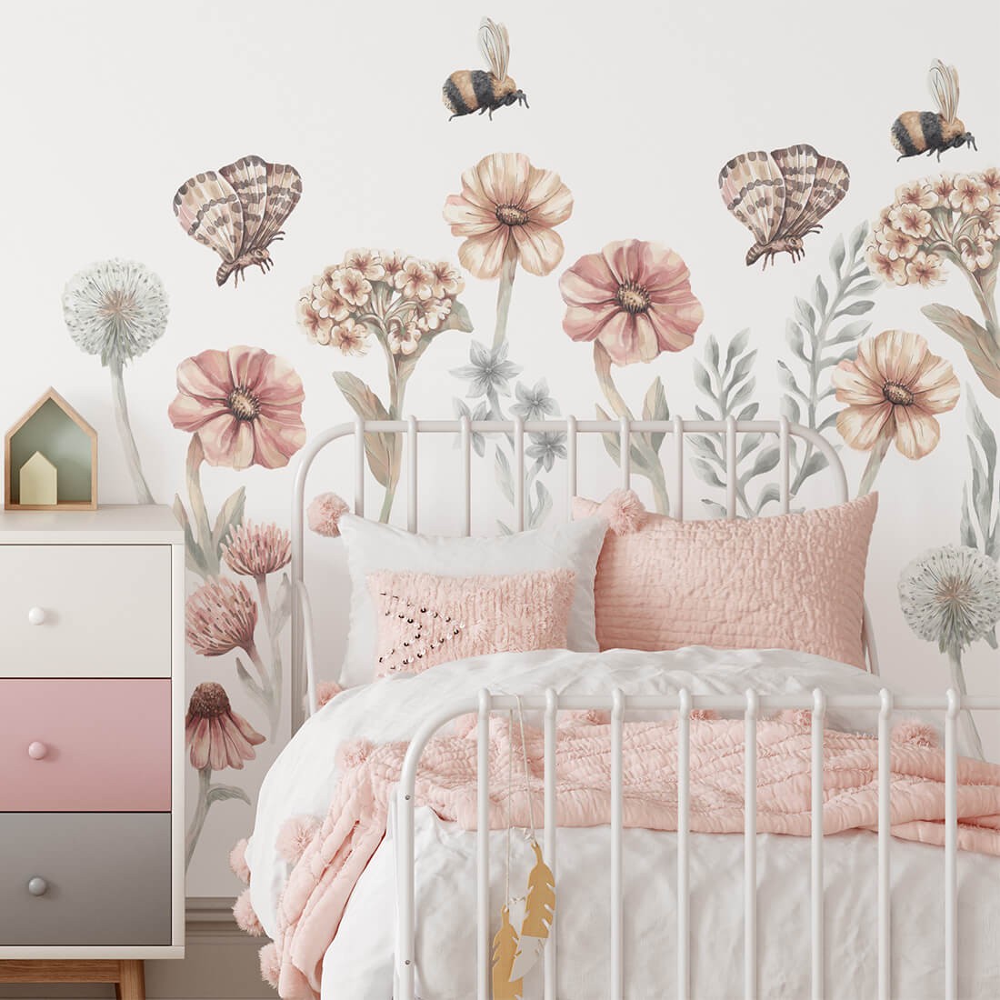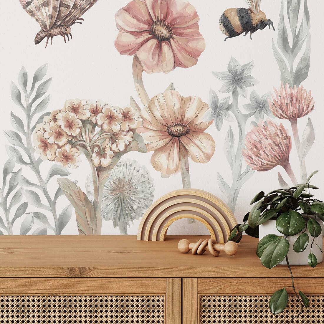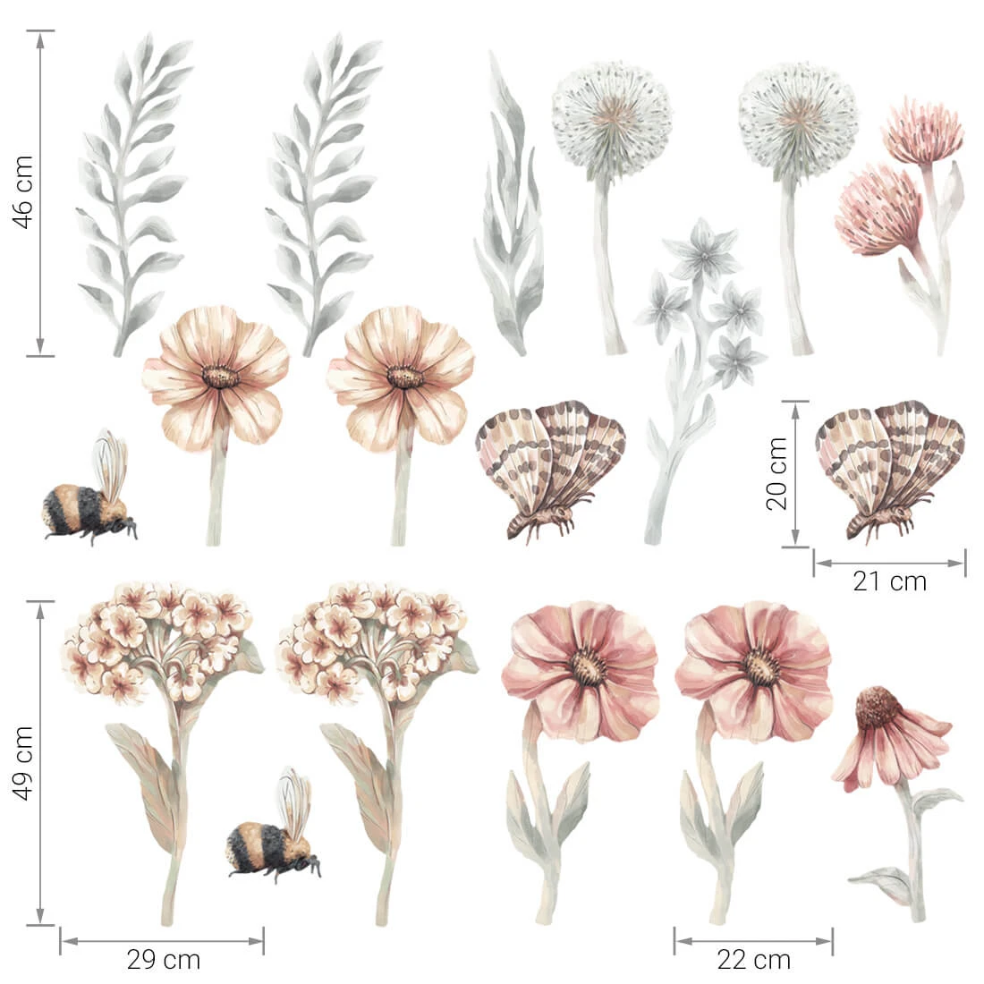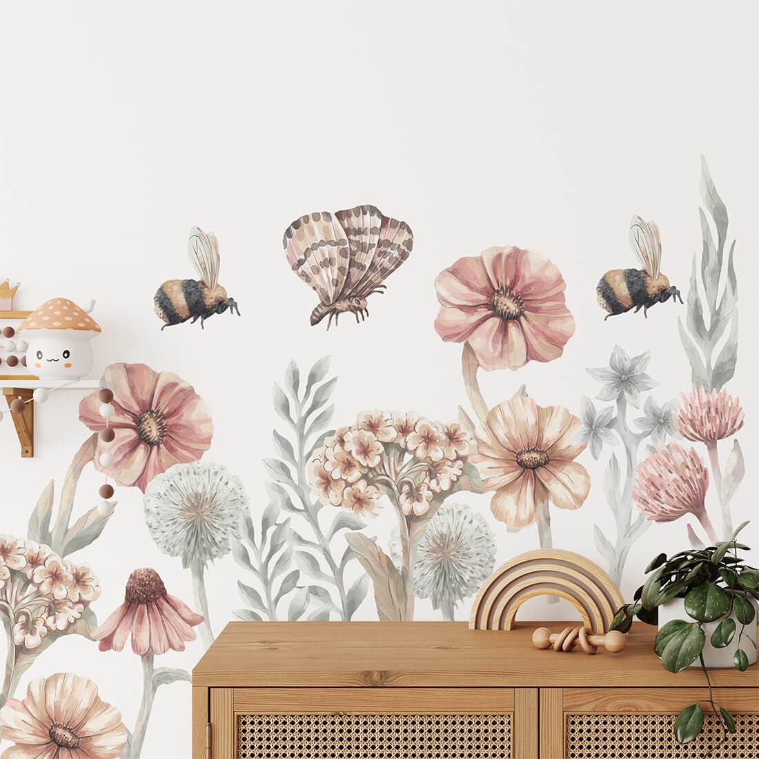 Naklejka na ścianę kwiaty - "polne kwiaty" z uroczymi akwarelowymi kwiatami, motylami oraz pszczołami, stanowi doskonałą propozycję dla osób poszukujących naturalnej i spokojnej dekoracji pokoju dziecka.