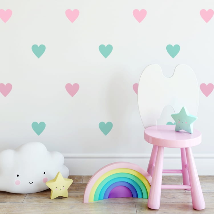 Kolorowe serduszka, szczególnie w odcieniach pastelowych stworzą uroczy nastrój w pokoiku Twojego malucha.