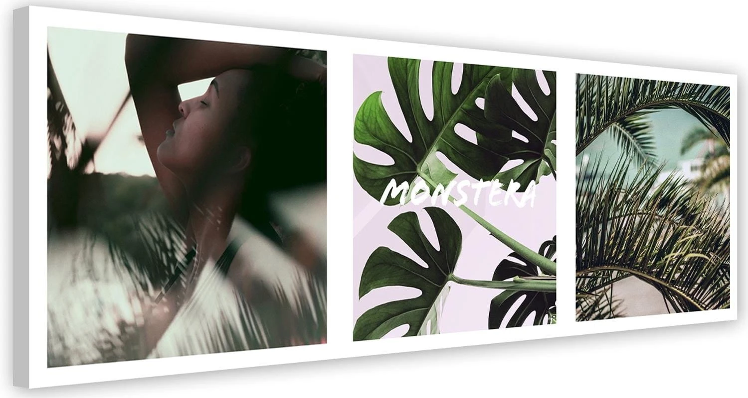 Jednoczęściowy obraz na płótnie typu canvas Panorama kobieta w liściach monstera to doskonała dekoracja do Twojego wnętrza. Stosowane przez nas płótno posiada widoczną strukturę zbliżoną do płótna malarskiego. Nadruk na bokach daje ciekawy efekt odbicia lustrzanego.