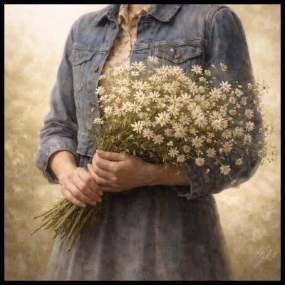Wprowadź do swojego wnętrza spokój i naturalną elegancję dzięki wyjątkowemu plakatowi przedstawiającemu kobietę trzymającą delikatny bukiet drobnych kwiatów.