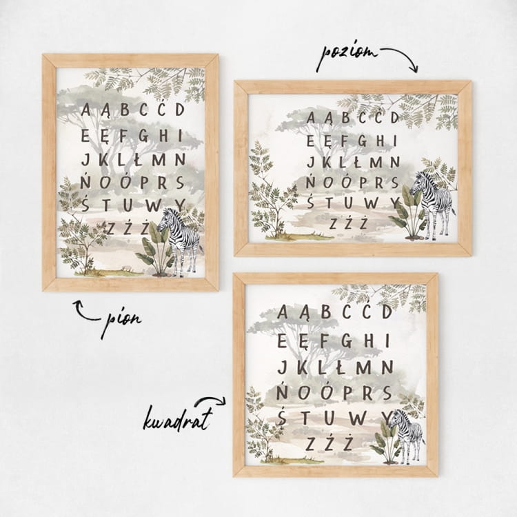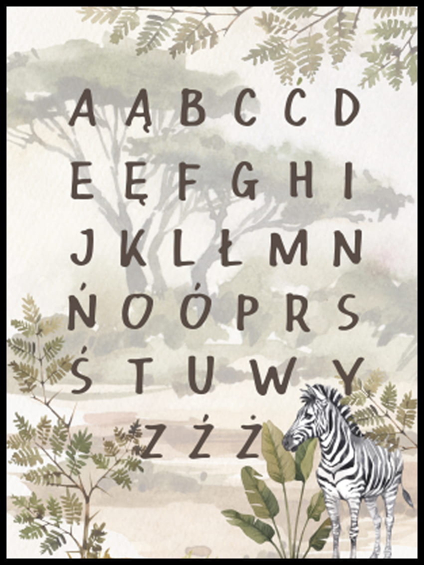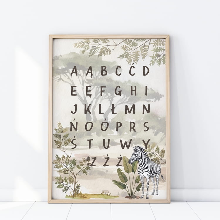 PLAKAT ALFABET SAFARI sprawdzi się zarówno jako samodzielna dekoracja, jak i dodatek do produktów z kolekcji safari.