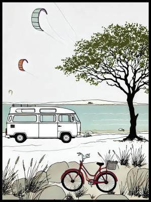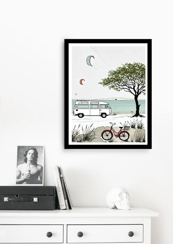 Ten piękny plakat autorski przedstawia klasyczny, retro van zaparkowany na plaży, z rozległym oceanem rozciągającym się po horyzont. Subtelne, pastelowe barwy nadają kompozycji spokojny, nostalgiczny charakter, który idealnie wkomponuje się w każde wnętrze, wnosząc do niego atmosferę relaksu i beztroski.