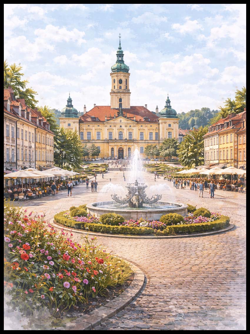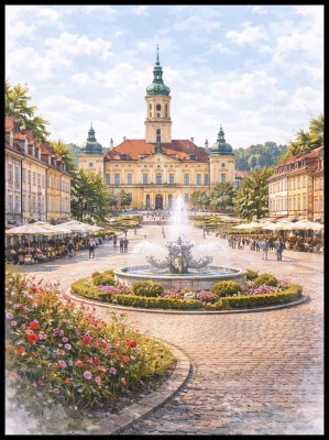 Ta unikatowa interpretacja artystyczna, wykonana z niezwykłą dbałością o szczegóły techniką akwareli, przeniesie Cię w zakątki pełne historii i zielonych oaz miejskich, które tworzą duszę tego fascynującego miasta.