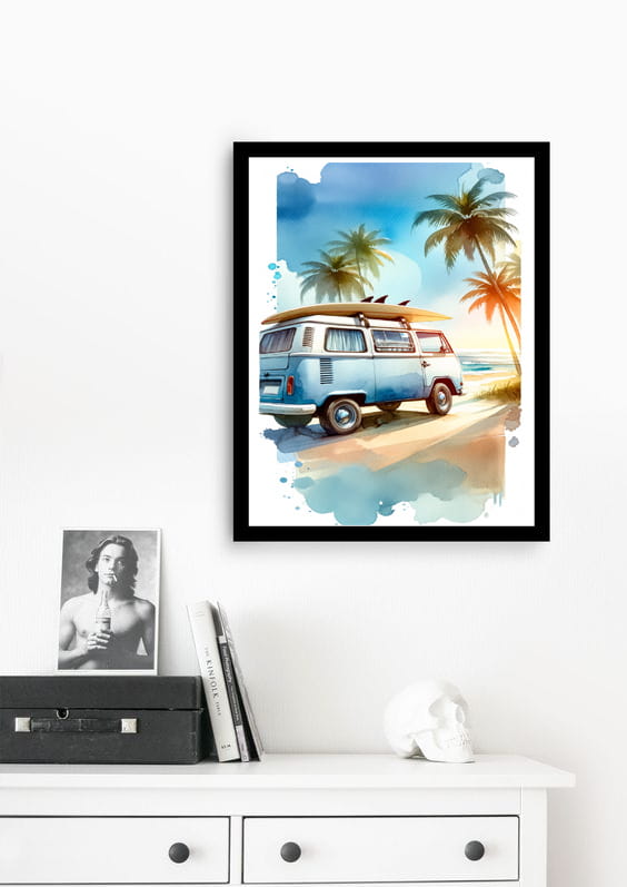 Ten piękny plakat autorski przedstawia klasyczny, retro van zaparkowany na plaży, z rozległym oceanem rozciągającym się po horyzont. Subtelne, pastelowe barwy nadają kompozycji spokojny, nostalgiczny charakter, który idealnie wkomponuje się w każde wnętrze, wnosząc do niego atmosferę relaksu i beztroski.