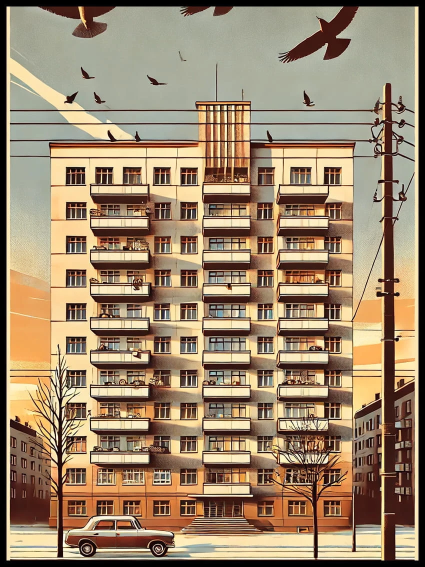 Nowoczesny plakat na ścianę – Blok w stylu retro - nada charakter Twojemu wnętrzu.