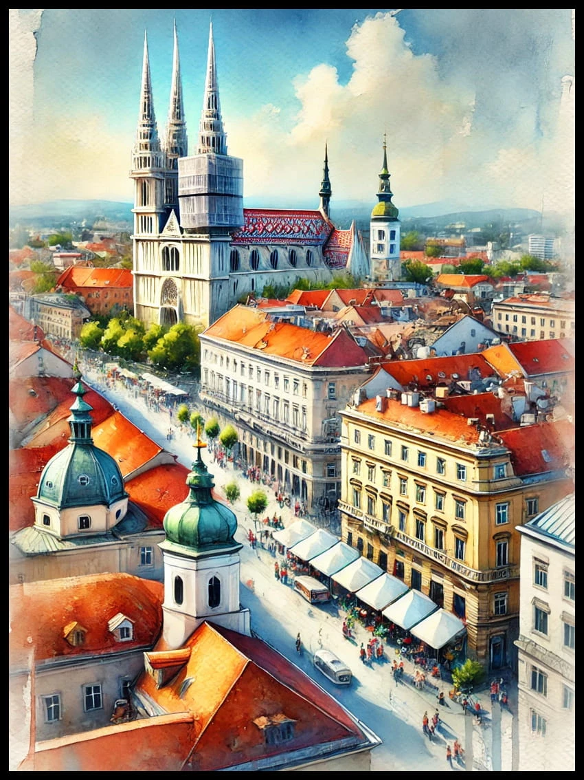 Odkryj urok stolicy Chorwacji z plakatem przedstawiającym Zagrzeb, w którym historia spotyka się z nowoczesnością.