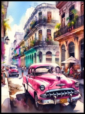 Ten urzekający plakat Cuba - różowy samochód zabiera widza w serce kubańskiego klimatu. Centralnym punktem obrazu jest zabytkowy, klasyczny samochód z lat 50-tych, zaparkowany na tle kolorowych, kolonialnych budynków Hawany.