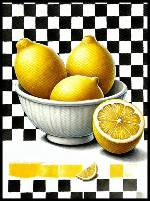 Żywe, soczyste żółcie cytryn na tle głębokiej czerni i bieli tworzą dynamiczny kontrast, przyciągając wzrok i dodając energii każdemu wnętrzu.
