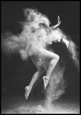 Artystyczne, czarno-białe zdjęcie gimnastyczki tańczącej w chmurze białego pyłu. Fotografia jest bardzo dynamiczna ze względu na ułożenie ciała młodej kobiety oraz fakt, że dziewczyna unosi się w powietrzu w wyskoku.