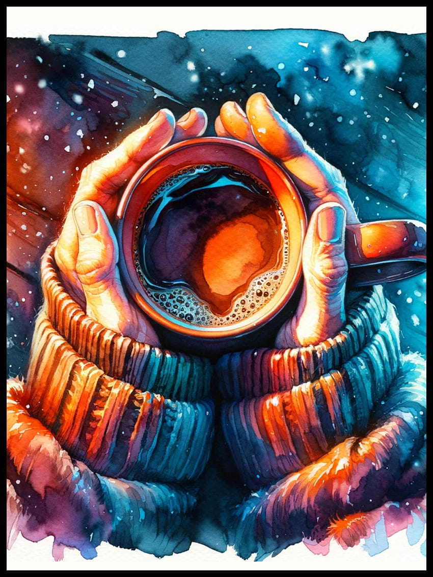 Plakat, Dłonie z kawą akwarela