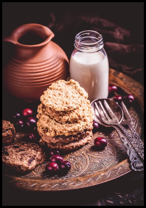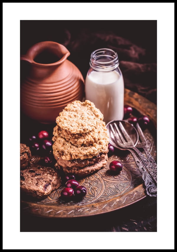 Zdjęcie - plakat do kuchni z ciastkami, żurawiną i mlekiem na ozdobnej tacy.