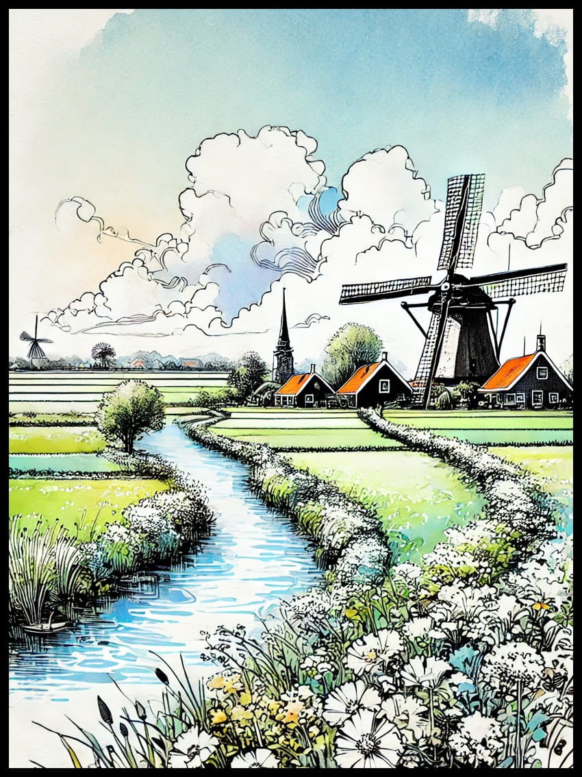 Ta zachwycająca grafika przenosi nas w serce Danii, gdzie rozległe, zielone krajobrazy łączą się z malowniczymi widokami nadmorskich fal i tradycyjnej architektury.