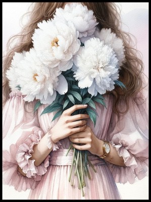 Spojrzenie na tę delikatną kompozycję, gdzie piwonie tkały swe płatki wokół dziewczyny, prowokuje wyobraźnię i zaprasza do refleksji. Jej twarz, ukryta za kwiatowym welonem, wabi tajemnicą i zachęca do odkrywania nieznanego.