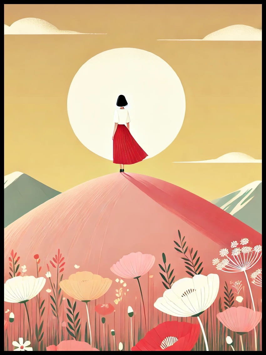 Przenieś się do świata pełnego spokoju i naturalnego piękna dzięki plakatowi przedstawiającemu dziewczynę w czerwonej spódnicy na tle słońca.