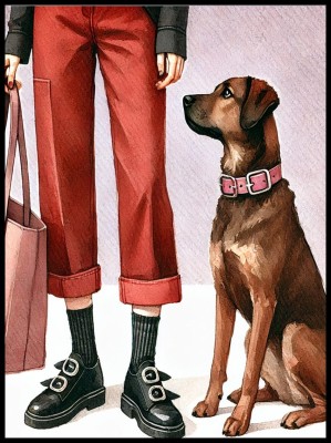 Ukazuje kobiece nogi w stylowych butach oraz psa na smyczy, tworząc obraz pełen elegancji i prostoty.