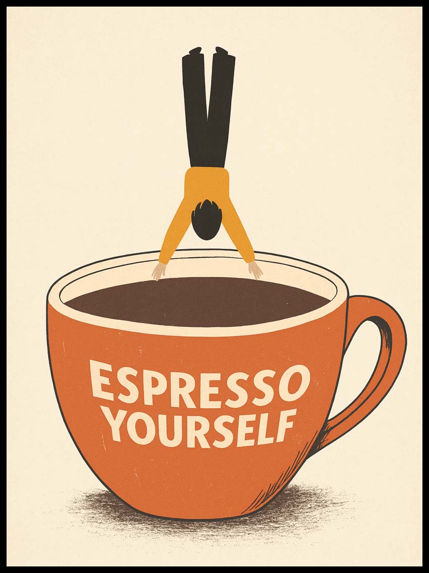Plakat „Espresso Yourself” to oryginalna dekoracja z nutą humoru, idealna dla miłośników kawy i pozytywnego nastawienia do życia.