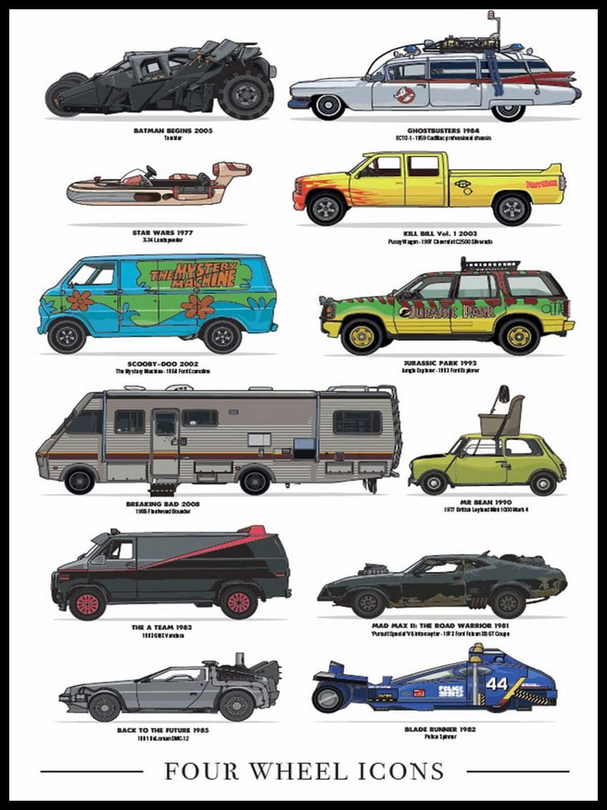 Bardzo fajny plakat przedstawiający różne rodzaje retro samochodów