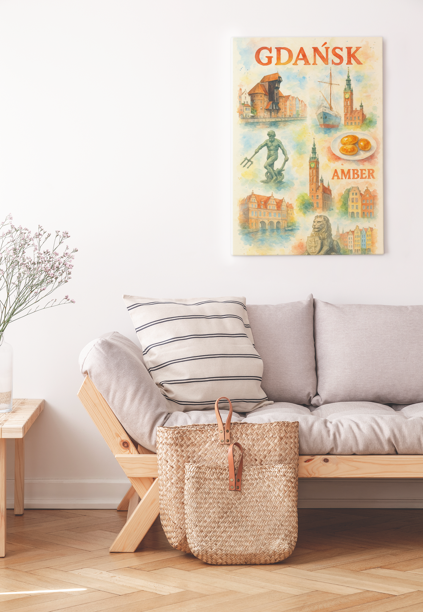 Plakat „Witamy w Gdańsku” to wyjątkowa ilustracja w stylu akwarelowym, która w artystyczny sposób ukazuje klimat nadmorskiego miasta.