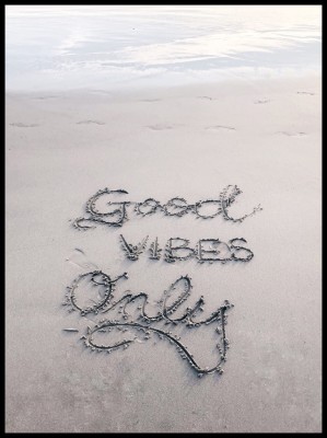 Nowoczesny plakat na ścianę –Good Vibes only to oryginalny sposób na wystrój wnętrza. Napis na piasku na plaży do częsty sposób wyrażania uczyć. Zazwyczaj jest to wyznanie miłości ale u nas pozytywne Good Vibes :)