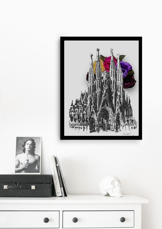 Plakat, Grafika Sagrada Familia Barcelona - z kwiatami