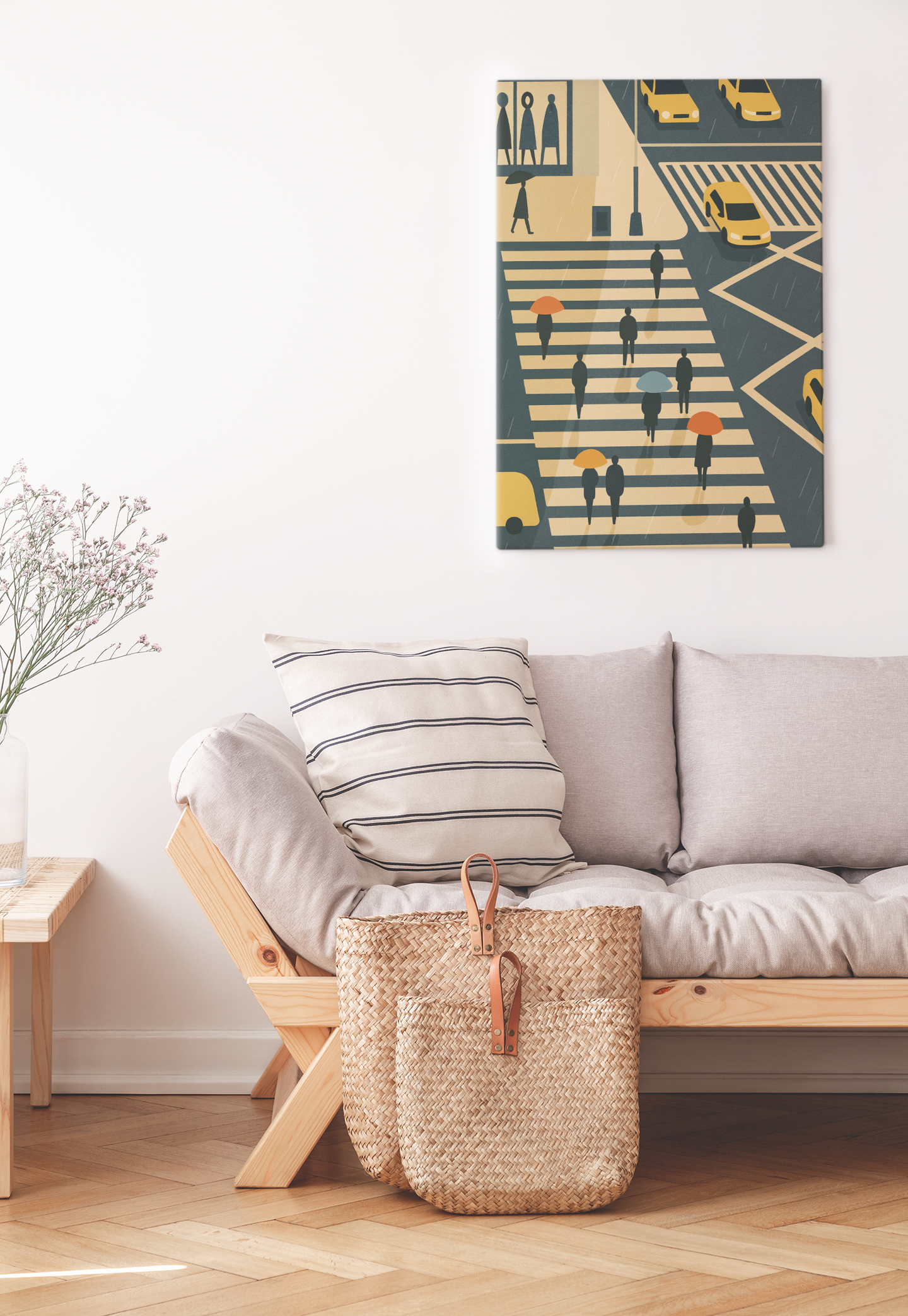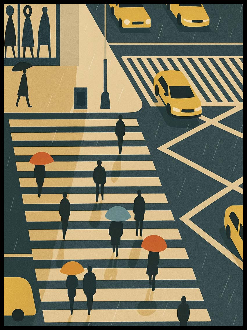 Plakat "Ruch uliczny" to nie tylko dekoracja, to okno na świat, które przenosi do miejsca, gdzie tradycja spotyka się z nowoczesnością, a kultura uliczna miesza z wysokim stylem. Idealny dla miłośników urbanistyki, podróżników duszą, a także wszystkich, którzy cenią sobie sztukę z głębią i charakterem.