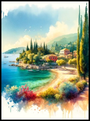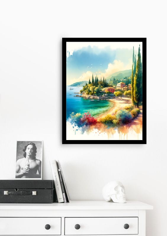 Plakat "Korfu - Grecja" jest nie tylko wyjątkowym dodatkiem dekoracyjnym, ale również zaproszeniem do świata niezrównanego greckiego piękna, który przeniesie Cię w najbardziej malownicze zakątki Morza Egejskiego bez wychodzenia z domu.