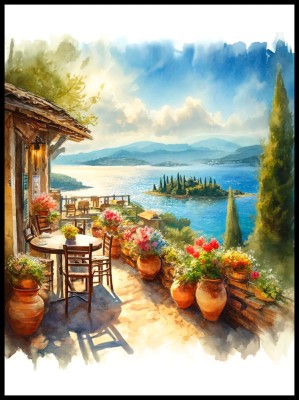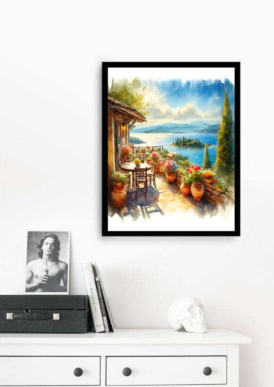 Przedstawione w hipnotyzujących odcieniach błękitu i bieli, które są symbolem tej wyspy, sceny z Santorini na naszym plakacie oddają esencję spokojnego, ale zarazem pełnego życia stylu śródziemnomorskiego.