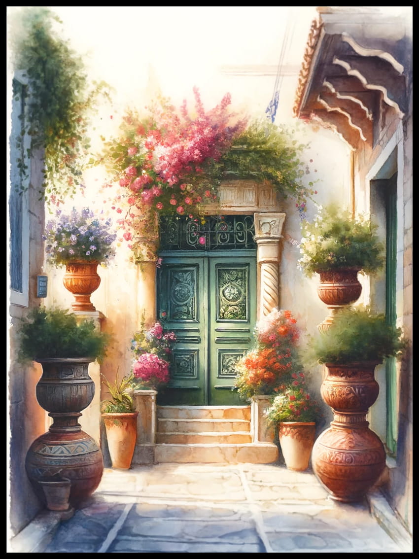 Plakat, Grecja Stare drzwi- akwarela