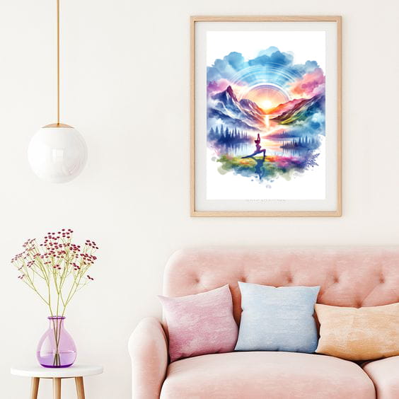 Nowoczesny plakat na ścianę – Joga w górach nada charakter Twojemu wnętrzu.