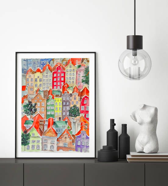 Plakat przedstawiający centrum miasta idealnie oddaje klimat miasta Gdańsk.