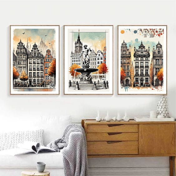 Żuraw w Gdańsku idealnie pasuje do plakatu Dźwigi czy też Trzy Krzyże w Gdańsku. Można również stworzyć zestaw z plakatem z napisem. Uzupełniamy naszą piękną kolekcję o kamieniczki w Gdańsku.