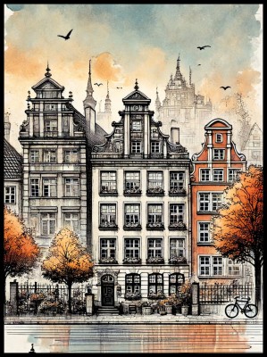 Plakat przedstawiający kamienice w Gdańsku idealnie oddaje klimat miasta Gdańsk.