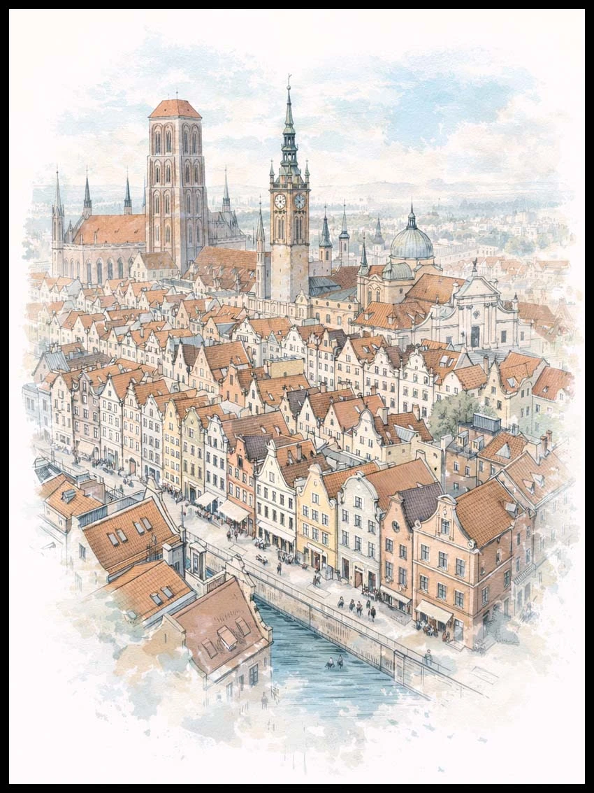 Charakterystyczne dachy, wąskie fasady i historyczny układ ulic tworzą graficzną mozaikę, która oddaje niepowtarzalny rytm Gdańska – miasta, w którym historia spotyka się ze współczesnością.