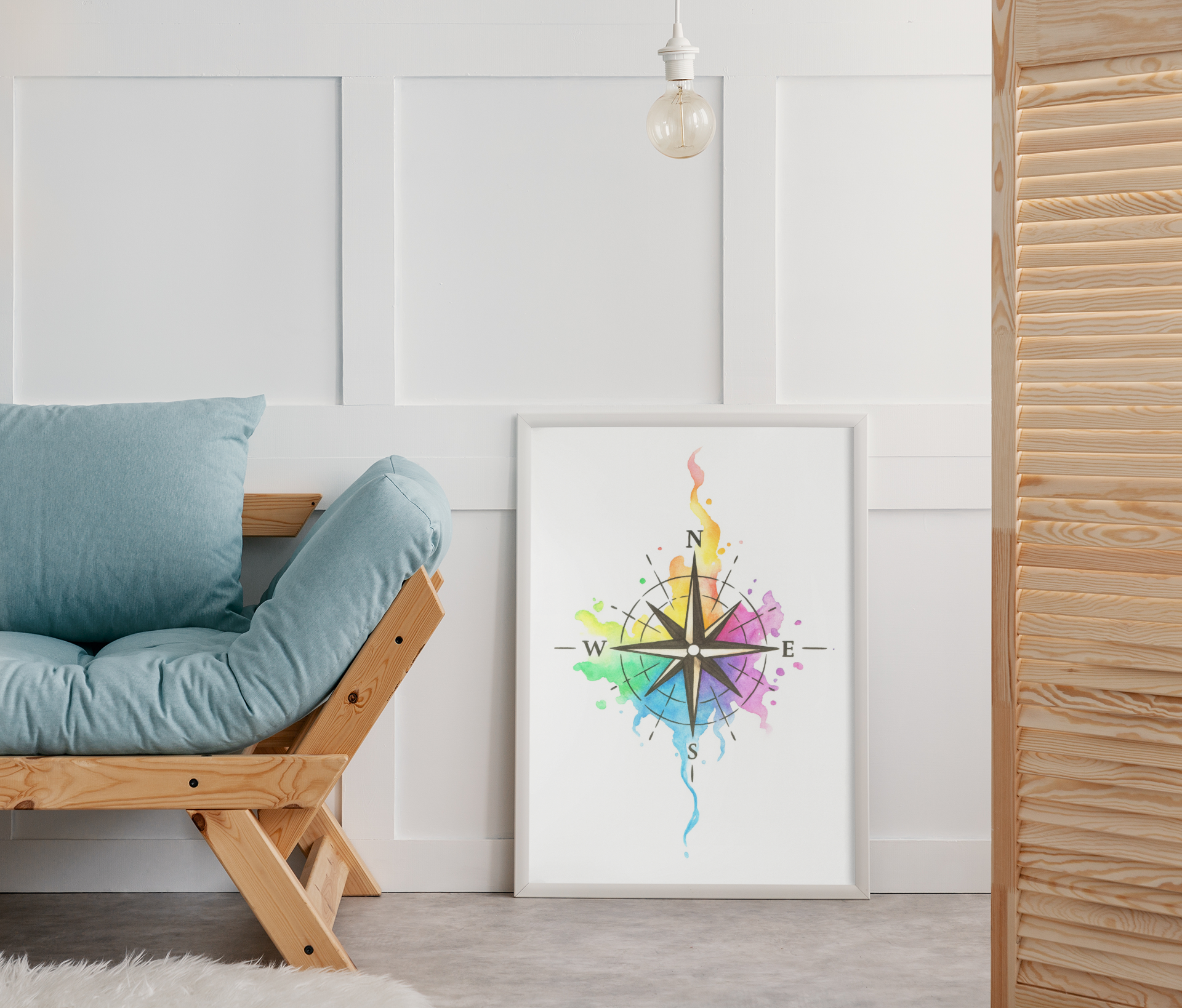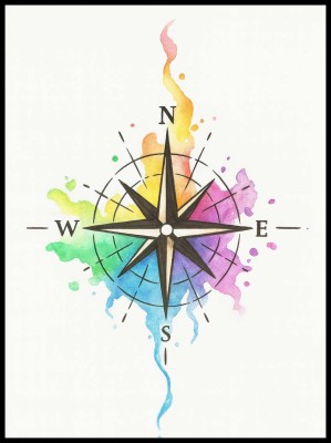 Centralny motyw kompasu w odcieniach czerni otacza tło w formie kolorowych, akwarelowych plam – od żółci, przez zieleń i błękit, po fiolet i róż.