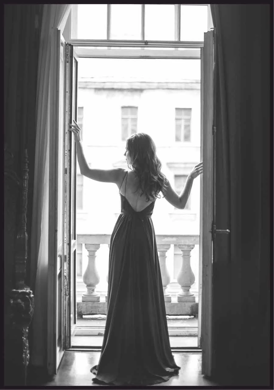 Tajemnicza piękność wyglądająca przez balkon to ciekawa grafika w odcieniach czerni i bieli.